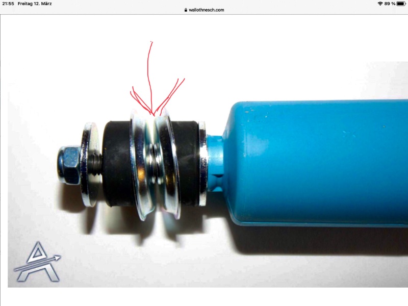Offenbar sind das keine Originaldämpfer, ergo auch keine Originalbefestigung - bei denen gehören die Scheiben doch oben und unten an den Gummi und kein Metall ins Loch. Oder ?