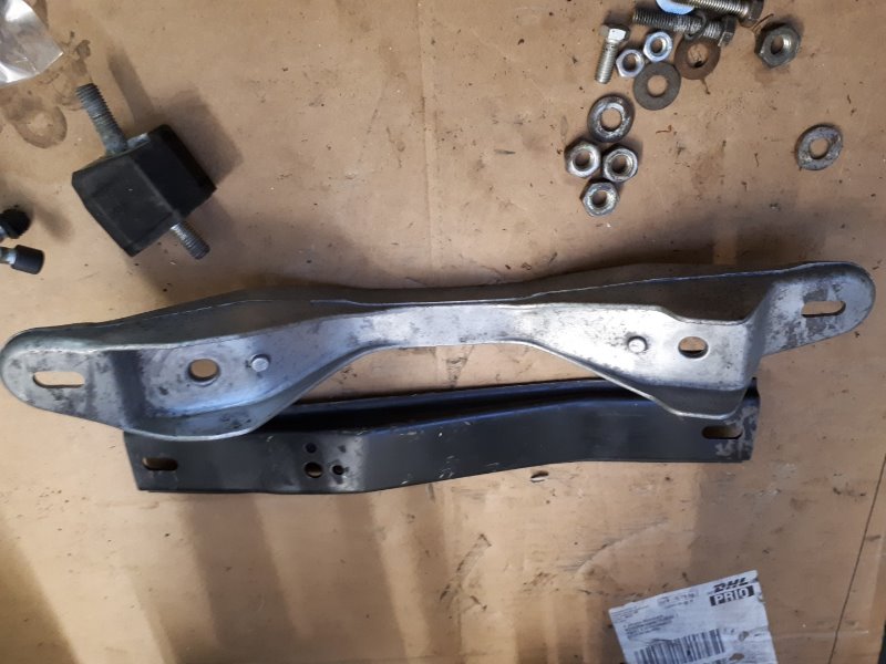 Sie ist im Vergleich zu der zum 4-Gang-Getriebe gehörenden (schwarzen) Brücke viel breiter, aber da sie an den beiden seitlichen Haltepunkten angebracht wird und sich der Tunnel nach vorne hin verbreitert passt sie wohl (hoffentlich). Sie war mal in einem E28 verbaut, aus dem auch das vordere Getriebe stammt.