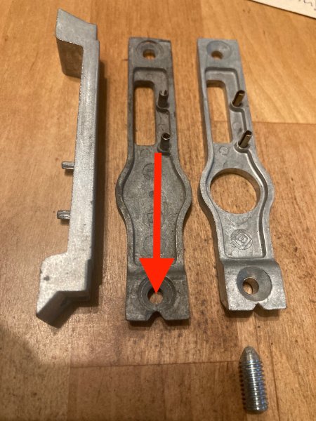 Mit Keil gespalten meine ich, dass dort wo die Madenschraube an der schrägen Ebene vom Keil ansetzt, zum Befestigungsloch hin ein Riss ist. Das ist deutlich an dem mittleren Keil zu sehen, dann kann die Madenschraube nicht fest klemmen und der Keil muss ausgetauscht werden.
