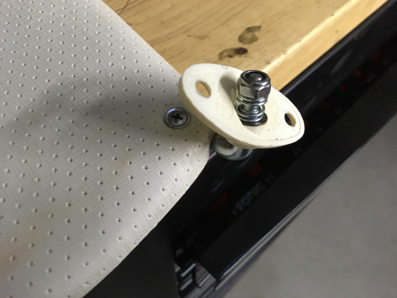 Jetzt habe ich die originale Klammer und Feder dort entfernt. Nachdem ich dort ein M6 Gewinde geschnitten habe und eine kurze Feder montiert habe schwenkt die Blende ganz leicht ohne die Plastikhalter über Gebühr zu belasten.
