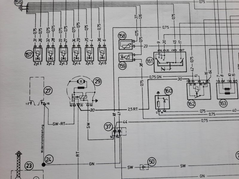 Du siehst nach oben abgehend die weißen Adern mit den Nummern 18 und 44 sowie 41(hatte ich fälschlicherweise als 1 gedeutet). Ader 41 geht zum Hauptrelais 162, Ader 44 geht zum Kaltstartrelais 168 und Ader 18 zum Steuergerät.