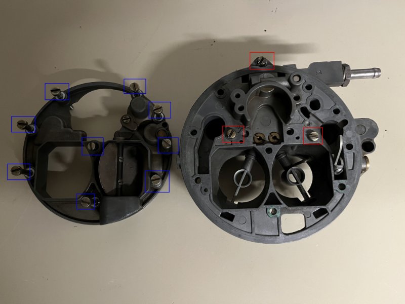 ich denke wir reden da nicht vom Gleichen, denn meiner Meinung nach meint der Jakob die Befestigung der Platte mit der Düsenbestückung am Schwimmerkammergehäuse (3x rot). Die Schraube in der Mitte hält den Oberteil auf dieser (9x blau) und ja, die in der Mitte hab ich auch gesucht damals... ;-)
