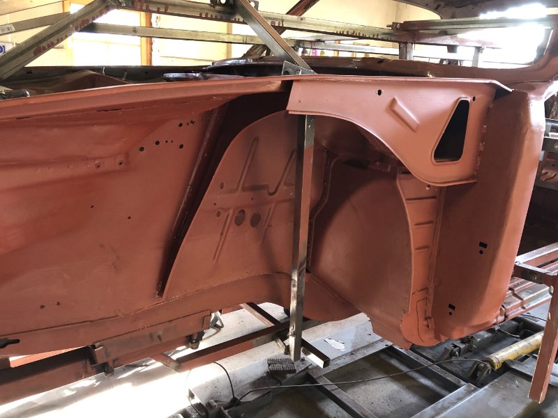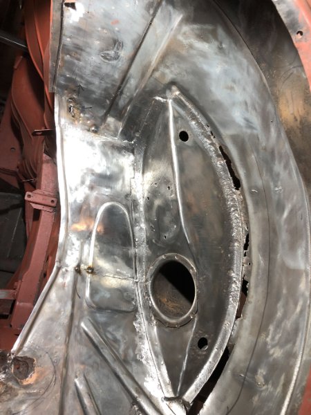 Radhaus v. l. ist so gut wie fertig. Eigentlich könnten jetzt die Kotflügel wieder dran, aber 1. muss der Linke noch inst. gesetzt werden (Blech ist schon da) und 2. muss der Wagen erst vom Drehspieß runter, damit ich Türen und Motorhaube zum "Anpassen" der Spaltmaße montieren kann. das wird noch lustig, da ja der Vorgänger was das angeht schon Einiges vermurkst hat und da schon nix gepasst hat...
