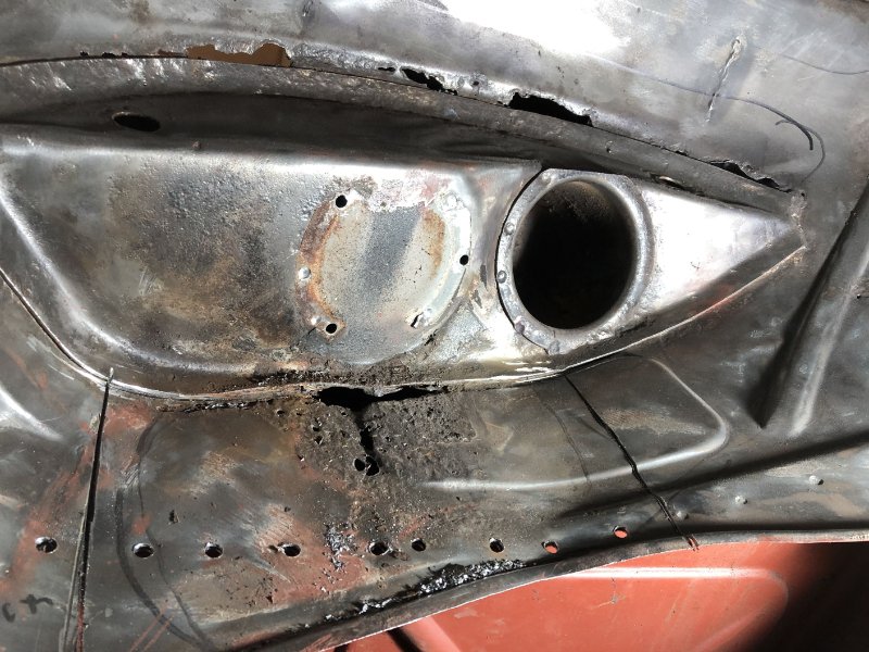 Zuerst habe ich alle Kleinbaustellen (vor allem den Übergang vom unteren Frontblech zum rechten Kotflügel, das habe ich schon ewig vor mir hergeschoben) von unten erledigt, damit das Drehgestell wech kann. Dann habe ich im Kofferaum noch ein paar zusätzlich Streben eingesetzt und nu' is' der Drehspieß erstmal ab. Außerdem habe ich schonmal angefangen, den Kofferboden auszubohren und zu zersägen, dabei kam natürlich wieder einiges von der braunen Pest zum Vorschein. Schön war auch zu sehen wie die Bleche teilweise doppellagig zusammengeklebt waren...