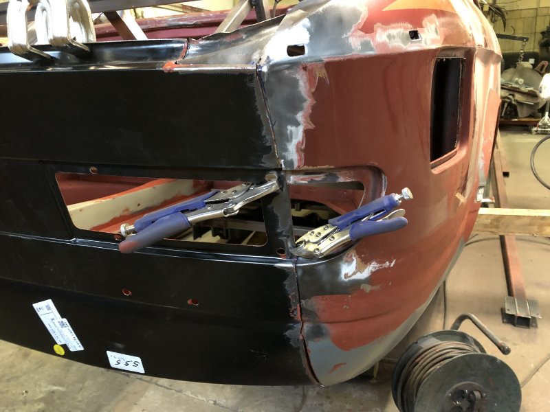Ja, seit vorgestern ist das Blech auch drin. Zum Einpassen habe ich dann auch noch die Rückleuchten zur Hilfe genommen und wo es ging die Punktschweißzange verwendet. Das ging ganz gut am oberen Rand zum Kofferdeckel und am oberen Rand der Rücklichter der ja mit dem Schloßträger verbunden wird.