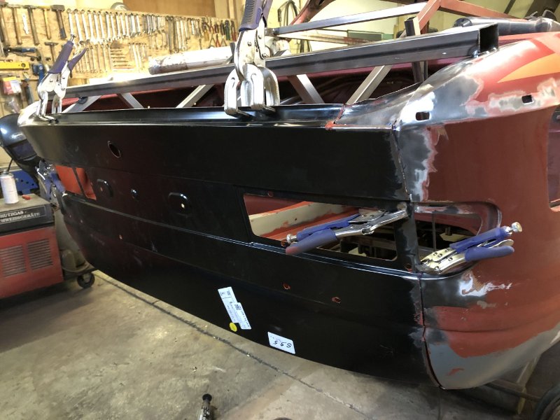 Und weiter geht's, die Verstrebung im Heck ist entfernt und der Heckdeckel mal probehalber drauf gelegt um zu schauen wie es mit dem Heckblech passt. Sieht für noch nicht verschraubt schon ganz gut aus...