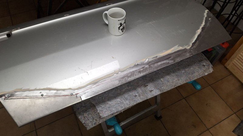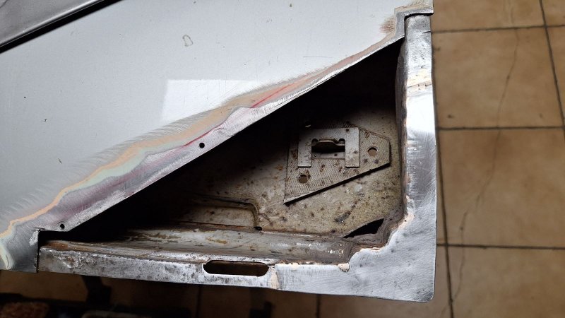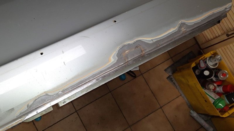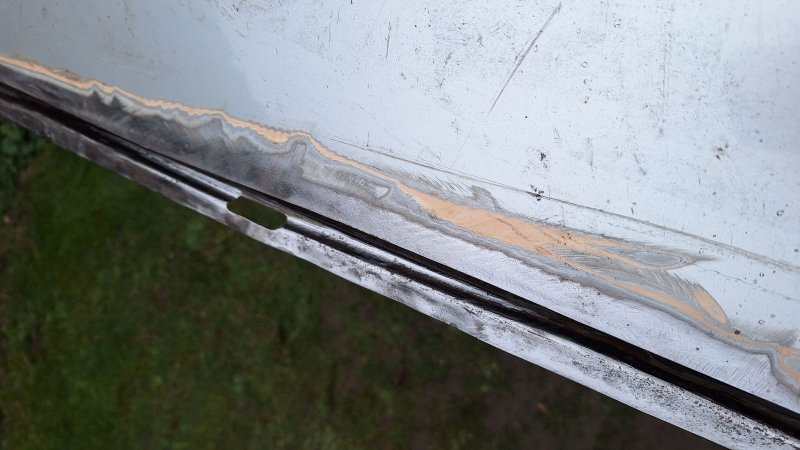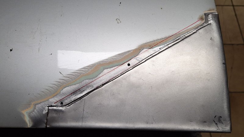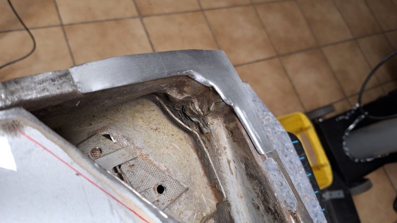 heute habe ich die Nähte an der Türoberkante mit Cusi3 zugepunktet und verschliffen. Habe Cusi3 erstmalig ausprobiert, es hat gegenüber MAG den Vorteil das der Schmelzpunkt deutlich niedriger als beim MAG Schweißen liegt. Damit hat man weniger Hitze im Bauteil und somit weniger Verzug und geringere Gefahr Löcher ins dünne Blech zu brennen. Ein ganz klein wenig Spachtel wird wohl drauf müssen, an den meisten Stellen reicht vermutlich Spritzspachtel. Ist alles ganz gut glatt geworden. Die Schachtleiste sitzt gut. Jetzt noch innen den Flugrost entfernen und dann bekommt der Hohlraum und die innere Struktur eine ordentliche Ladung 2K Epoxy Grundierung. Das sollte reichen möglichen Rost für ethliche Jahre zu verhindern.