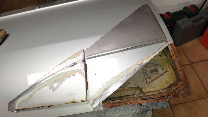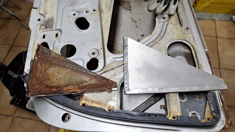 heute habe ich mit der vorderen Ecke der Beifahrertüre losgelegt. Zunächst habe ich die Maße für eine Schablone abgenommen. Dann ein erstes Blech mit Übermaß zurechtgeschnitten und das alte Blech herausoperiert.