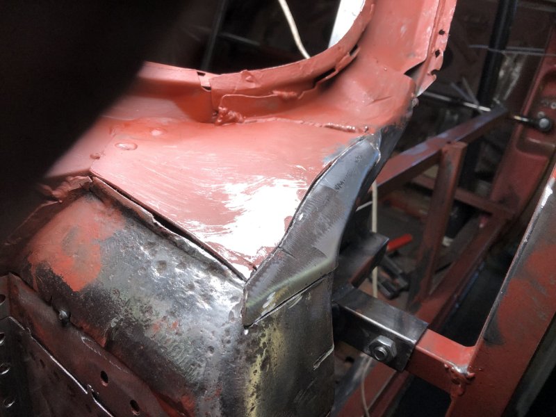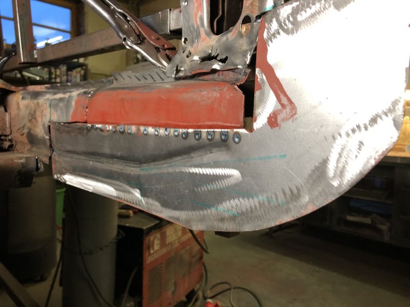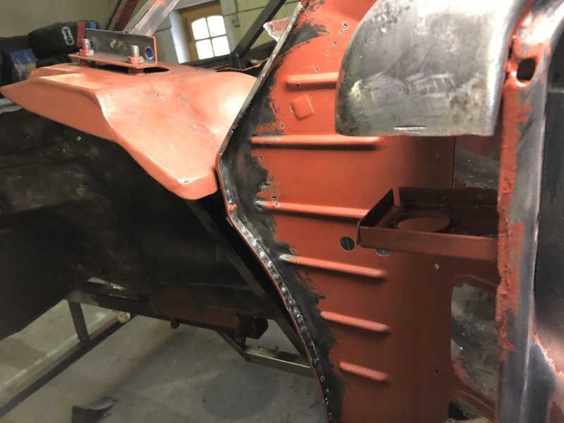 Rechts ist so langsam fertig, die Kotflügelkante ist gebördelt und verschweißt. Was jetzt noch fehlt ist eigentlich nur noch der Anschlag für den Gummipuffer. Der muss wohl neu, hat die Konsistenz von Papier.