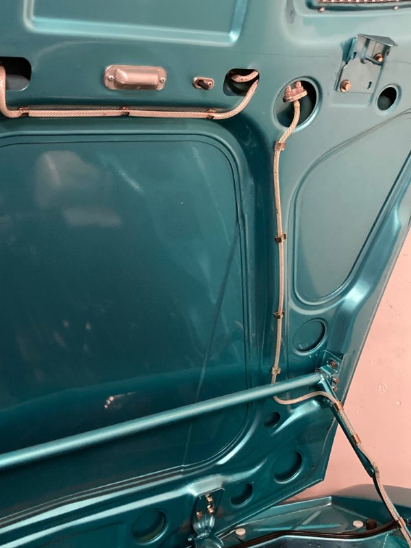 Ich wollte noch ein paar Bilder nachreichen. Ob das genau so original war, dass der Wasserschlauch direkt nach dem Verteilerventil in die Haube, und kurz danach wieder herausgeführt wird weiß ich nicht sicher. Hab hier schon mehrfach beide Varianten gesehen. Ansonsten sind die 2 + 1 Klammern am Scharnier und die 7 anderen sicher genau so original. Bei den Klammern an den Scharnierstangen muss man beachten, dass es diese in 2 unterschiedlichen Varianten gibt, einmal für Befestigung an dickem Material wie den Scharnierstangen, und auch auf einfaches Blech geklemmt. Die sehen sich sehr ähnlich.