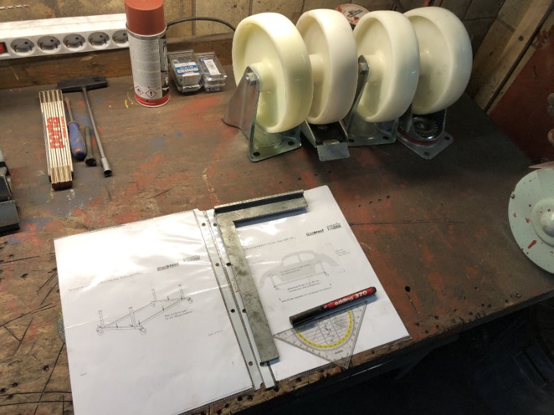 Ist auch nicht sooo viel passiert am CS die letzten Wochen, gibt ja eigentlich auch nix mehr zu machen bis zum Termin bei Carblast. Noch ein paar kleinere Arbeiten hier und da, die Schwelleraufsätze habe ich mir noch bestellt und ein neues Transportgestell für's KTL habe ich auch noch gebaut, die haben da bestimmte Vorgaben was Maße und Rollen angeht. Dafür mußte ich meinem Zugfahrzeug ein bisschen Aufmerksamkeit zuwenden, beim T5 waren die Domlager hinüber, da hat er gleich ein Gewindefahrwerk bekommen, das alte hatte ja nun auch schon 280.000 Km aufm Buckel und glich eher einer Sänfte, und da ja die Werkstatt belegt ist musste ich das ganze aufm Boden machen, bei festen Schrauben dauert das dann schon mal 2 Tage...