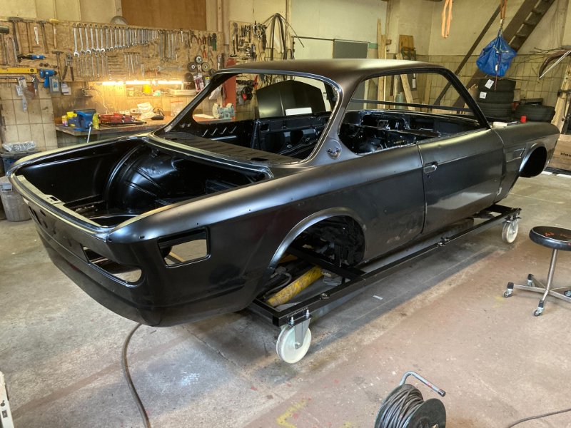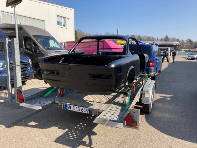 Gestern war ich beim Lackierer da er ja noch auf dem Anhänger steht und das Wetter gut war hat sich das angeboten. Werde jetzt erstmal Türen und Hauben montieren und ausrichten, dann schaut er nochmal. Desweiteren werde ich das Rollgestell so erweitern, dass der Wagen auf die Seite gekippt werden kann, um ihn von unten (und z. B. auch das Dach innen) besser lackieren und mit Steinschlagschutz versehen zu können.