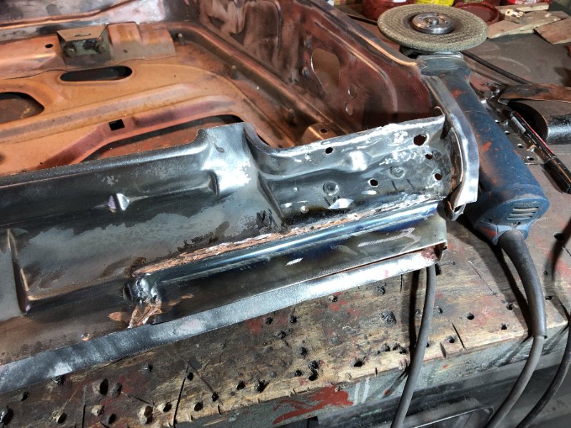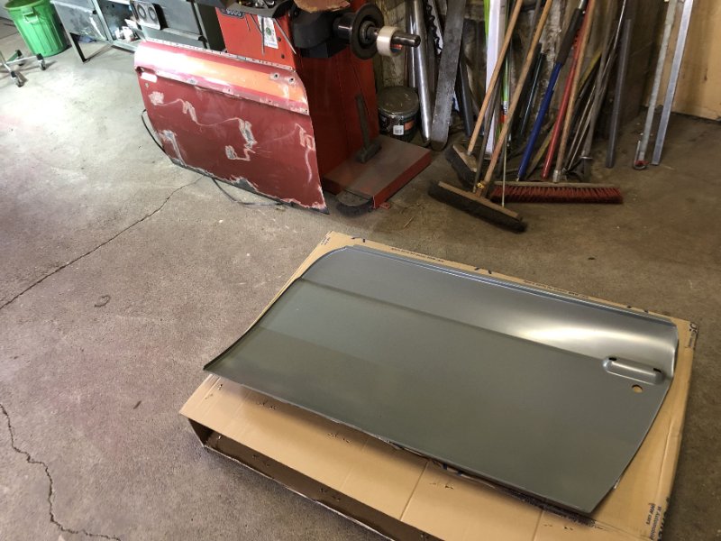 Weiter ging's wieder mit div- Haltern, den restlichen Schweißarbeiten der Kotflügel und der rechten Tür. Da habe ich ja noch ein Rostnest vorne unten gehabt. Wollte eigentlich nur die Stelle inst. setzen. Als ich das kleine Teilstück rausgeschnitten und auch mal die untere Kante von innen angeschaut habe war zu sehen, dass der gesamte Falzbereich unten betroffen ist. Also gleich Handy gezückt und das äußere Türblech geordert, sind ja noch Blechwochen und 25,- Eur. Rabatt bei Bestellungen über 250,- Eur. auch noch eingeheimst...