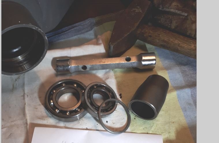 Ich habe eine 30er Nuss genommen, die Form leicht konisch und passte genau durch das große Lager. Habe dann einen dünnen Blechstreifen genommen und konnte die Nuss dann außermittig auf den inneren Lagerring fixieren. Außen erhitzt und dann ausgeschlagen, wobei ich nach jedem Schlag den Lagerinnenring etwas gedreht habe. Das kleine Lager ging dann leicht, weil die fehlende Hülse dann ja den Weg freigegeben hat.