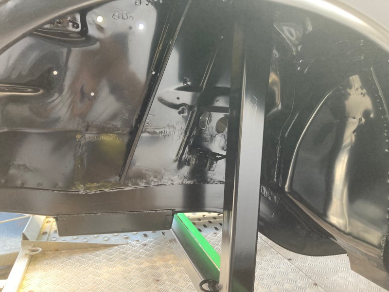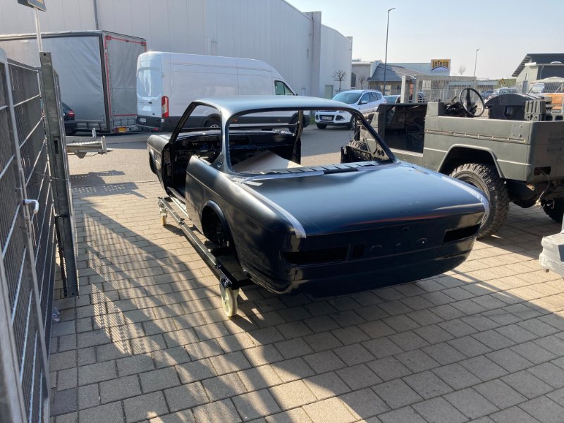 Gestern war ich beim Lackierer da er ja noch auf dem Anhänger steht und das Wetter gut war hat sich das angeboten. Werde jetzt erstmal Türen und Hauben montieren und ausrichten, dann schaut er nochmal. Desweiteren werde ich das Rollgestell so erweitern, dass der Wagen auf die Seite gekippt werden kann, um ihn von unten (und z. B. auch das Dach innen) besser lackieren und mit Steinschlagschutz versehen zu können.