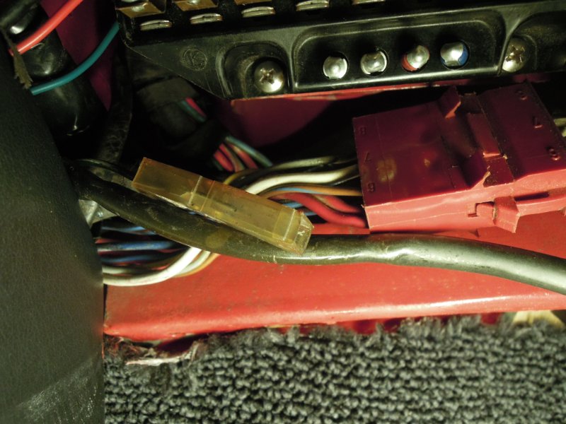 Am Sicherungskasten habe ich einen Widerstand <1 Ohm gemessen. Ich habe versucht, die beiden Kreise separat zu messen, was daran gescheitert ist, dass ich deren Stecker nicht rauskriege. Nach sorgfältigem Wiedereinbau des Sicherungskastens messe ich 2.3 Ohm (entspricht etwa 6 A) - spontane Selbstheilung? Eine Sichtprüfung aller Kabel ergab nichts verdächtiges. Schliesslich fiel mir ein leerer Steckverbinder an einem grün-weissen Kabel auf.