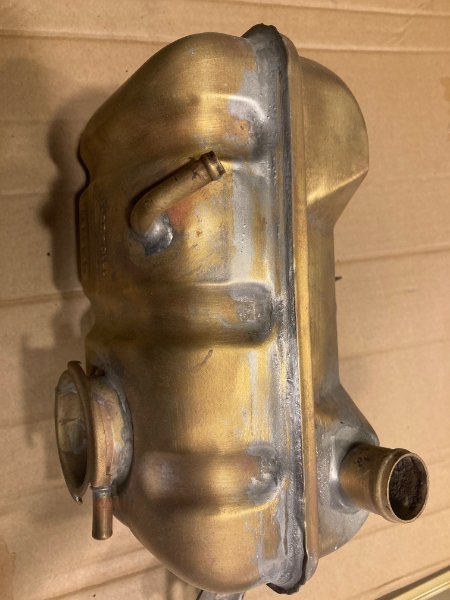 Ich war mit meinen Behältern beim Profi (Kühlerbau Spannagel in Mannheim) Der Meister erklärte mir, dass das alte Lötzinn komplett entfernt werden muss, an allen gelöteten Bauteilen. Also hab ich meine Behälter zuerst chemisch entlacken lassen. Die Behälter wurden dann komplett zerlegt, er besteht aus 8 Einzelteilen. Dann wurden die Behälter ausgebeult und wieder chemisch vorbereitet. Wichtig ist hier das richtige Flussmittel zu verwenden, da nur so die Oxydschichten aufgerissen werden. Entgegen der früheren Verlötungen, wird heute nicht mehr am Lötzinn gespart. Zu diesem Punkt dann auch das Bild. Am Ende wird der Behälter noch lackiert und er hält wieder ein paar Jahrzente. Die Kosten für alle Arbeiten waren allerdings 4 mal so hoch wie ein neuer Plastikbehälter kostet.