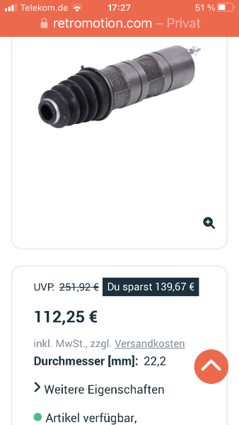 Hier mal ein Bild von meinem Sorgenkind und eins von der Händlerseite, wo sich die Daten irgendwie widersprechen. Oder hatte der 3.0 CS und der CSi wirklich noch mal andere Zylinder mit der gleichen OEM Nummer verbaut? Jedenfalls steht das im Widerspruch zu der damaligen Aussage des ET-Katalogs von W+N wo drin steht, dass dieser Zylindertyp für alles Modelle des E9 bis '73 verbaut wurden.