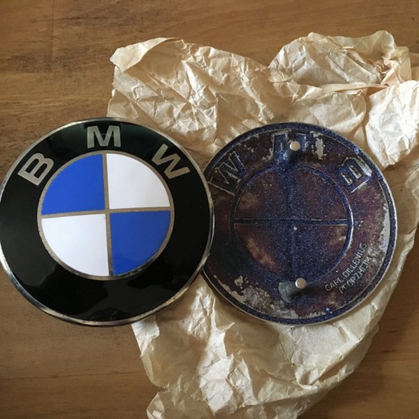 Es ist im Durchmesser 82 mm und damit identisch wie ein Blech-Emblem welches im E9 vorne und hinten mit separatem Ring verbaut wurde. Es passt also in den Ring. Die Oberfläche ist aus Email, genau wie die vom 2000 CS und den frühen 2800 CS. Ebenso hat es schon die "neue" Schrift, also ohne den Füßchen an den Buchstaben und damit schließe ich den Barockengel mal aus. Der einzige Unterschied zu den seltenen E9 Emblemen ist jedoch, dass die Befestigungsstifte hinten nicht waagrecht links und rechts, sondern oben und unten angebracht sind. Klar kann man die Löcher in der Frontmaske und dem Heckdeckel umbohren, man hätte damit neue absolute Raritäten. Aber sie müssen doch für irgend ein Modell hergestellt worden sein.....