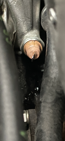 Nachdem ich dann den Motor hab im Stand 1min laufen lassen konnte ich sehen das das Öl unterhalb des Öldruckschalters heraustritt (gar nicht mal so wenig). Das Gehäuse (brauner Bereich) ist auch lose - lässt sich mit dem Finger erfühlen - und hat scheinbar einen riss. ich muss mir jetzt erst eine lang-nuss beschaffen damit ich das Bauteil dort rausbekomme.