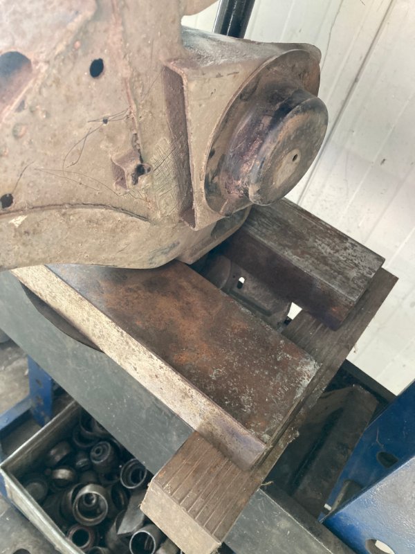 Ich bin gerade mal wieder dabei ein paar Dreieckslenker zu überholen. Bei den bisherigen die ich überholt habe, waren die Bremsbleche immer stark verrostet und ich konnte die Achsstummel immer direkt über das Bremsblech auspressen. Die verbogenen und verrosteten Bremsbleche hab ich danach immer entsorgt. Nun hab ich aber einen Querlenker bei dem das Bremsblech wie neu ausgesehen hat, und ich wollte es nicht beschädigen. Also hab ich es abgeschraubt, den Querlenker auf die Presse gelegt und überlegt wie man das beschädigungsfrei ausbauen könnte. Zufällig lagen vier 4 Kantteile (Vollmaterial) in der Werkstatt. Stabile 4 Kantrohre hätte ich wohl auch verwenden können:-) Nach diesem Kraftakt hab ich die unteren zwei Lager längs hingelegt, so dass das Bremsblech zwischen rein passte. Die nächste zwei Lager hab ich quer darüber gelegt und den Querlenker an der Bremszangenaufnahme auf diese Lager gelegt. Nun konnte ich den Achsstummel einwandfrei auspressen.