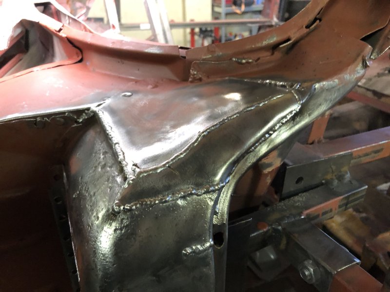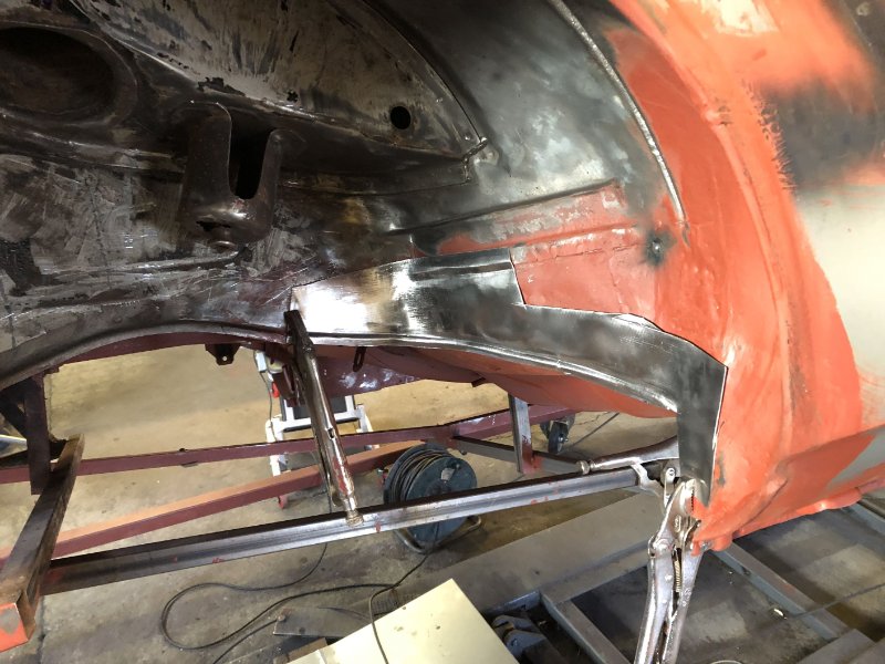 Rechts ist so langsam fertig, die Kotflügelkante ist gebördelt und verschweißt. Was jetzt noch fehlt ist eigentlich nur noch der Anschlag für den Gummipuffer. Der muss wohl neu, hat die Konsistenz von Papier.