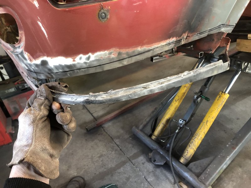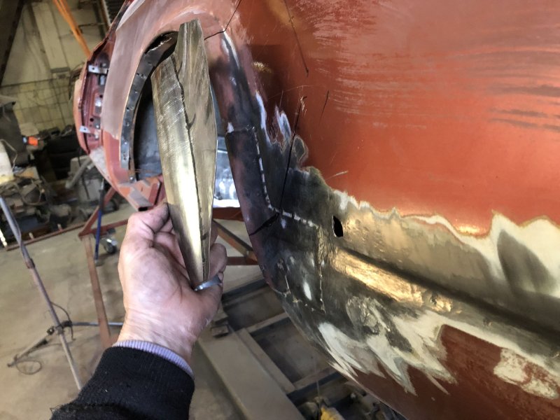 Ja, seit vorgestern ist das Blech auch drin. Zum Einpassen habe ich dann auch noch die Rückleuchten zur Hilfe genommen und wo es ging die Punktschweißzange verwendet. Das ging ganz gut am oberen Rand zum Kofferdeckel und am oberen Rand der Rücklichter der ja mit dem Schloßträger verbunden wird.
