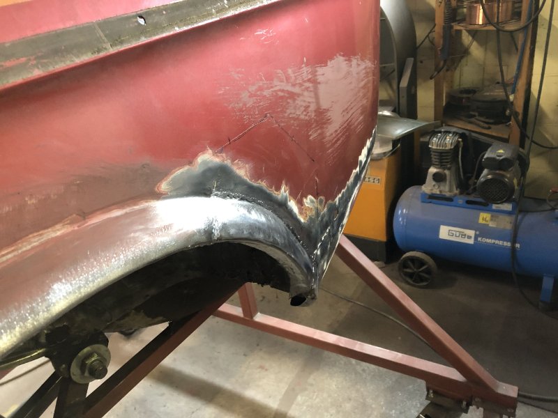 Die letzten Tage waren produktiv, das Radhaus istr soweit erstmal fertig und das linke Schwellerende ist fast ohne Verzug drin. Vieeeel Zeit gelassen zwischebn den Punkten und jeden mit der Druckluftpistole sofort abgekühlt.