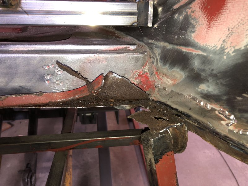 Zuerst habe ich alle Kleinbaustellen (vor allem den Übergang vom unteren Frontblech zum rechten Kotflügel, das habe ich schon ewig vor mir hergeschoben) von unten erledigt, damit das Drehgestell wech kann. Dann habe ich im Kofferaum noch ein paar zusätzlich Streben eingesetzt und nu' is' der Drehspieß erstmal ab. Außerdem habe ich schonmal angefangen, den Kofferboden auszubohren und zu zersägen, dabei kam natürlich wieder einiges von der braunen Pest zum Vorschein. Schön war auch zu sehen wie die Bleche teilweise doppellagig zusammengeklebt waren...