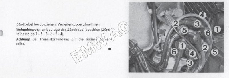 Wenn Du das Kabel vom 6.Zylinder auf den Anschluss des 1. am Verteiler steckst, zündet der Zylinder 6, wenn er auf Ventilüberschneidung ist. So läuft kein Vergaser und kein Einspritzmotor. Der Unterschied aus dem BMW Bild begründet sich im Verbau unterschiedlicher Verteiler, wobei dann die '1' an gegenüberliegender Stelle 'landet'.