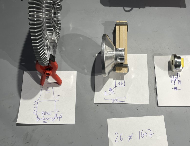 Es ist wie Thomas geschrieben hat, hab eben nachgemessen und du hast dich entweder bei der Visco vermessen oder hast die falsche. Mir erscheint es logisch, dass die Nut in die Feder muss, weil sich sonst die Verbindung durch die dauernden Lastwechsel lösen könnte.