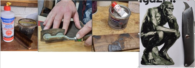 Hier tunlichst die Farbe "braun" wählen da "weiß" durch das Furnier durchscheinen könnte. Abgebrochene Ecken sowie Löcher die nicht dort sein sollten werden repariert: Hier wurde die Spitze erneuert. Was dem Kenner auffällt (oder auch nicht): im vorderen Teil des Seitenteils der Tür wurde wohl "Limba" als Furnierschicht verwendet!