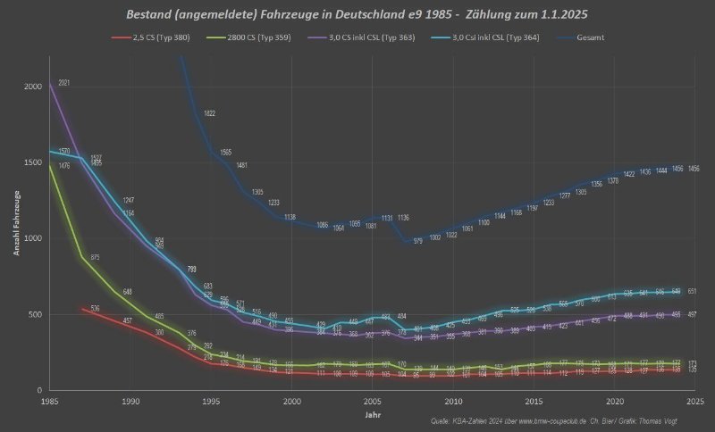 hier noch die Grafik der KBA-Zählung zum 1.1.2025: (% der in Deutschland, von den ursprünglich für den deutschen (EU) Markt gebauten Stückzahlen, noch erhaltenen Fahrzeuge; ohne UK und USA Modelle)