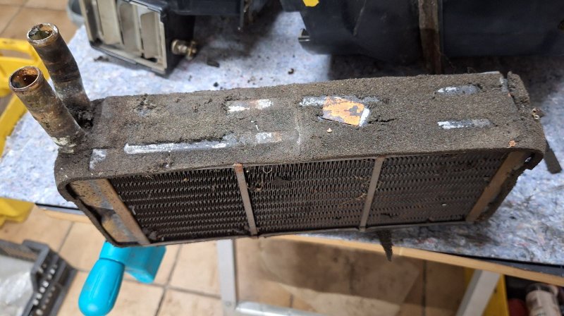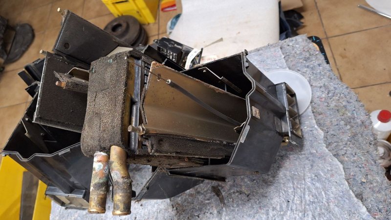 weiter geht's mit der Heizung. Der Ausbau ist schon recht fummelig, beim Heizkasten brauchte es schon etwas mehr als "sanfte Gewalt" um den Dichtrand von der Karosse zu trennen. Die ausgebauten Schächte und der Kasten waren schon ganz schön verdreckt, der Gedanke die Heizung / Lüftung so in Betrieb zu nehmen ist schon ganz schön ekelig. Funktional war soweit alles ok, der Motor lief geräuschfrei und die Hebelei funktionierte noch bis auf die Verstellung für Luft - oben - unten.