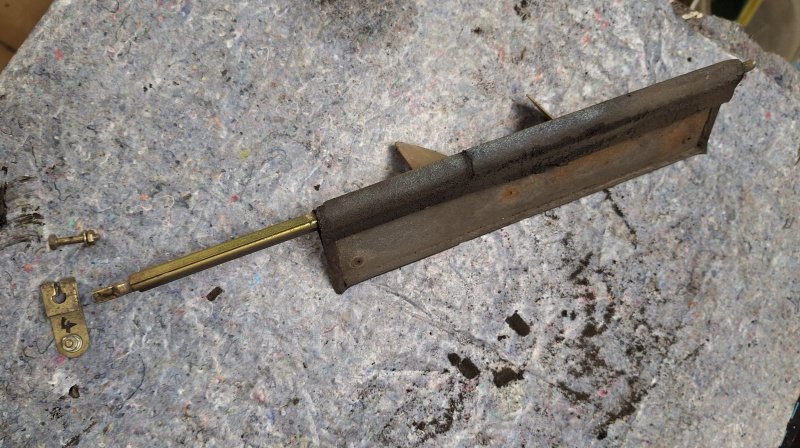 den gebrochenen Zug habe ich mit einer kleinen Messinghülse stabilisiert, dann die Hülse samt den Zugenden verlötet und anschließend noch mit 2K Metallkleber überzogen. Glücklicherweise war der Bruch recht weit oben, so dass sich der Zug noch über die komplette Länge betätigen lässt.