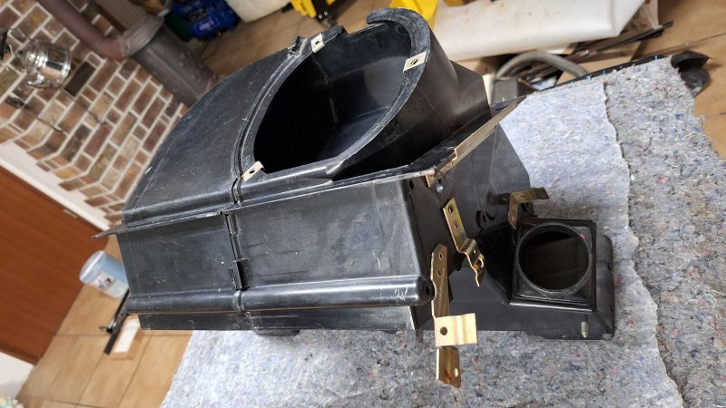 das Gehäuse ist nun soweit zerlegt und die vier Klappen ausgebaut. Die Klappen für den Fußraum sind nicht mit Schaumstoff beschichtetet und können im Gehäuse verbleiben.