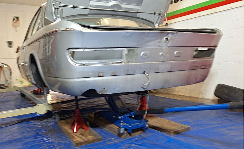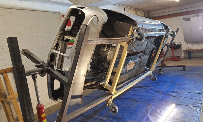 ....und ein weiterer wichtiger Schritt konnte endlich erledigt werden. Die Karosse steht jetzt auf einem Roll & Drehgestell. Die Karosse ohne Hebebühne auf das Rollgestell zu bekommen war schon eine leicht kippelige Angelegenheit, hat aber letztendlich doch dank Motorkran und großem Wagenheber ganz gut geklappt.