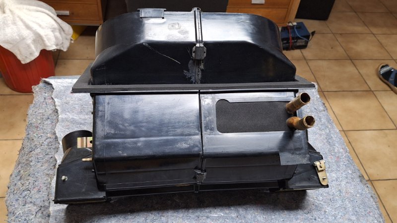das Gehäuse ist nun soweit zerlegt und die vier Klappen ausgebaut. Die Klappen für den Fußraum sind nicht mit Schaumstoff beschichtetet und können im Gehäuse verbleiben.