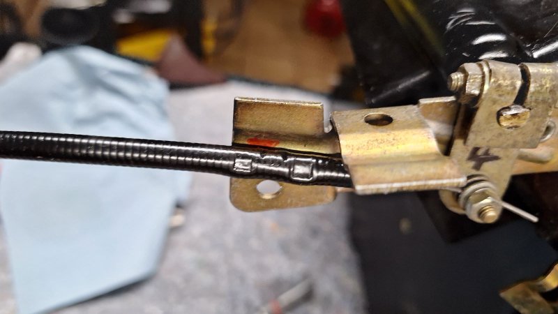 den gebrochenen Zug habe ich mit einer kleinen Messinghülse stabilisiert, dann die Hülse samt den Zugenden verlötet und anschließend noch mit 2K Metallkleber überzogen. Glücklicherweise war der Bruch recht weit oben, so dass sich der Zug noch über die komplette Länge betätigen lässt.