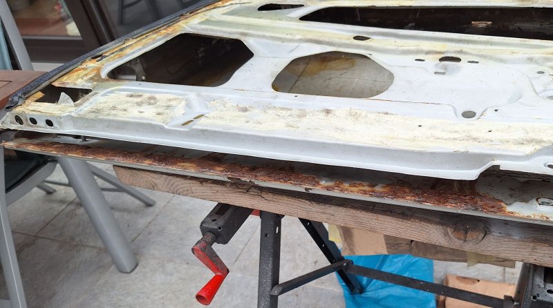 jetzt geht's mit den ersten Blecharbeiten los. Als Erstes habe ich mir die Beifahrertüre vorgenommen. Begonnen habe ich mit der Türoberkante. Rostmäßig sah die Türe auf den ersten Blick gar nicht so schlimm aus, aber nach genauerer Betrachtung..... fiel doch der innere Teil und die Außenkante des Fensterschachtes der Flex zum Opfer. Die Innen- und Außenkante war auf 50 cm perforiert und dünngerostet.