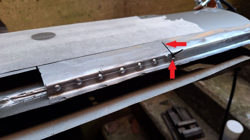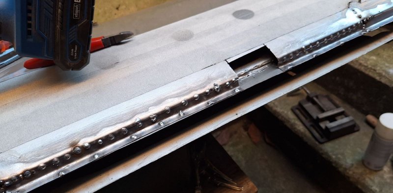 Um das innere und äußere Blech miteinander zu verbinden hatte ich in das erste Blech Löcher mit der Lochzange gestanzt. Am Ende schauten die Löcher über den Rand des Steges hinaus. Beim zweiten Blech habe ich dann die Löcher mit der Bohrmaschine gebohrt. Jetzt sind erst mal alle 4 Bleche eingepunktet und ein wenig verschliffen. Die kommenden Tage müssen dann die Nähte durchgepunktet werden und geglättet werden.