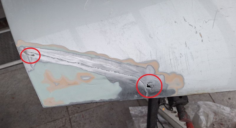 heute habe ich die Nähte an der Türoberkante mit Cusi3 zugepunktet und verschliffen. Habe Cusi3 erstmalig ausprobiert, es hat gegenüber MAG den Vorteil das der Schmelzpunkt deutlich niedriger als beim MAG Schweißen liegt. Damit hat man weniger Hitze im Bauteil und somit weniger Verzug und geringere Gefahr Löcher ins dünne Blech zu brennen.