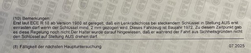 Allerdings habe ich die Plakette nicht zwingend durch die in diesem Thema befindlichen Dokumente erhalten sondern weil sich der Prüfer mit mehreren Kollegen (10) intern unterhalten / abgestimmt hat da in der ECE vor 1980 keine Information gesichtet wurde die besagt das der Schlüssel entfernt sein muss oder sonst was. Letztlich konnte ich die besagte ECE nicht erhalten. Habe aber einen entsprechneden Vermerk in dem Prüfbericht erhalten den ich mir mal gut ablege...