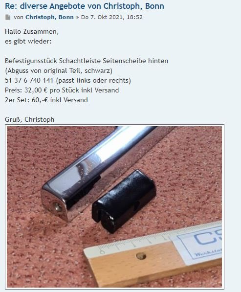 die äußere Schachtleiste wird mit dem (von Christoph angebotenem) Befestigungsstück an der Kante Höhe B-Säule arretiert und hinten gegen die C-Säule geschoben: