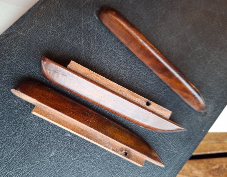 Die drei kleinen Einsteckleisten, geschnitzt aus Nußbaum,