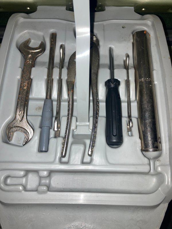Nun folgt ein Bild von dem Werkzeugkasten vom E12 Baujahr 79. Mit Absatz und mit Kunststoffschutz.