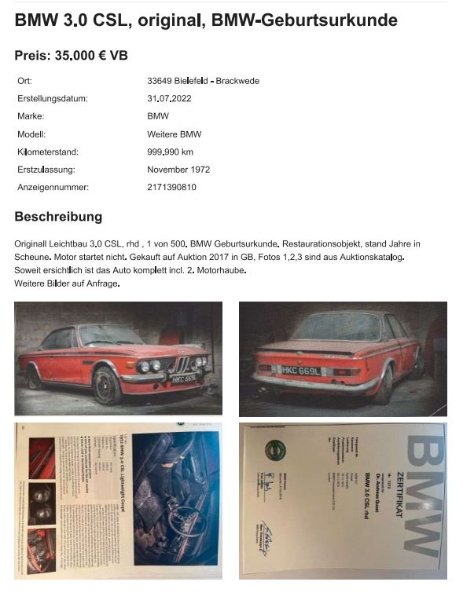 Ein CSL für 35T Euro, dazu praktisch in der Nachbarschaft. Das frühe Huhn pickt das Korn, anschauen kann man ihn sich ja mal! Habe natürlich nicht den Haushaltsvorstand geweckt um mir die Erlaubnis einzuholen.
