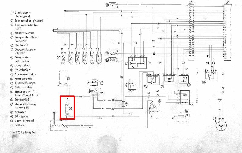 Ich bin mir hier nicht mehr sicher, das ist schon viele Jahre her, aber schau mal den umwickelten Kabelbaum wo er in der Frontmaske oben mit den 3 Kabelklemmen angebracht ist. Dazu beide Grills mal ausbauen, eventuell auch die Niere. Da war bei meinem 74er eine Lötstelle als Übergang von dem normalen Kupferkabel zum Widerstandskabel, ungefähr in der Mitte hätte ich aus der Erinnerung gesagt. Da hat der mit Gewebeband umwickelte Kabelbaum eine deutliche Verdickung durch die Lötstelle, das kann man sehen/fühlen. Bei mir war das Widerstandskabel das einzige im Auto, welches eine durchsichtige Isolierung hatte. Die ankommende Farbe sollte grün gewesen sein. Diese Leitung kommt vom Sicherungskasten mit Abzweig zum Diagnosestecker, deshalb sind in dem Bild von TomHom auch 3 grüne Kabel in dem Steckergehäuse über dem BKV zu sehen.
