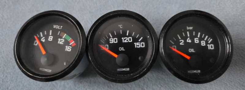 du hast da 3 verschiedene Anzeigen aus 3 jahrzehnten. Rechts ist eine vom Audi aus den 80ern, in der Mitte ist eine Wassertemperaturanzeige aus den 70ern und links eine moderne Öldruckanzeige aus den 90ern. Ich gehe davon aus, dass die beiden äusseren mit Kunststoffgehäuse sind, die kann ich nicht umbauen. Wenn du die Wassertemperaturanzeige für Öltemperatur nimmst, wird sie sicherlich einen falschen Wert anzeigen.