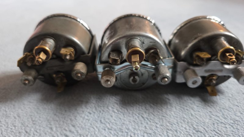 du hast da 3 verschiedene Anzeigen aus 3 jahrzehnten. Rechts ist eine vom Audi aus den 80ern, in der Mitte ist eine Wassertemperaturanzeige aus den 70ern und links eine moderne Öldruckanzeige aus den 90ern. Ich gehe davon aus, dass die beiden äusseren mit Kunststoffgehäuse sind, die kann ich nicht umbauen. Wenn du die Wassertemperaturanzeige für Öltemperatur nimmst, wird sie sicherlich einen falschen Wert anzeigen.